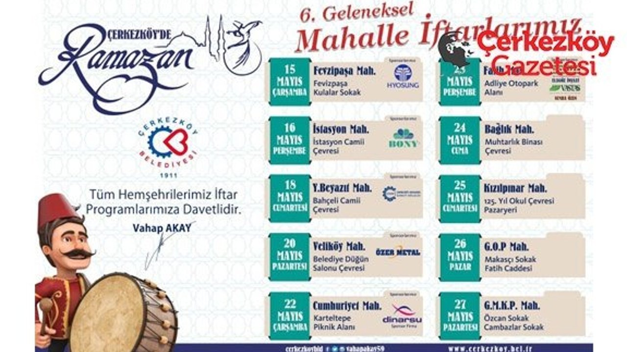 Çerkezköy’de 10 mahallede kurulacak olan iftar sofralarına tüm Çerkezköy halkını davet eden Çerkezköy Belediye Başkanı Vahap Akay, “Her yıl olduğu gibi bu yıl da oruçlarımızı mahalle iftarlarımızda buluşturacağımız binlerce vatandaşımız ile birlikte açacağız. Bu vesile ile bu yıl 6’ncısını gerçekleştireceğimiz mahalle iftarlarımıza katkı sunan Çerkezköy OSB yönetimine, Hyosung, Bony Tekstil, Teverpan, Vastaş, Özer Metal, Dinarsu ve Elagöz İnşaat firmalarına ve hayırsever Semra Özen’e teşekkür ediyorum” diye konuştu.