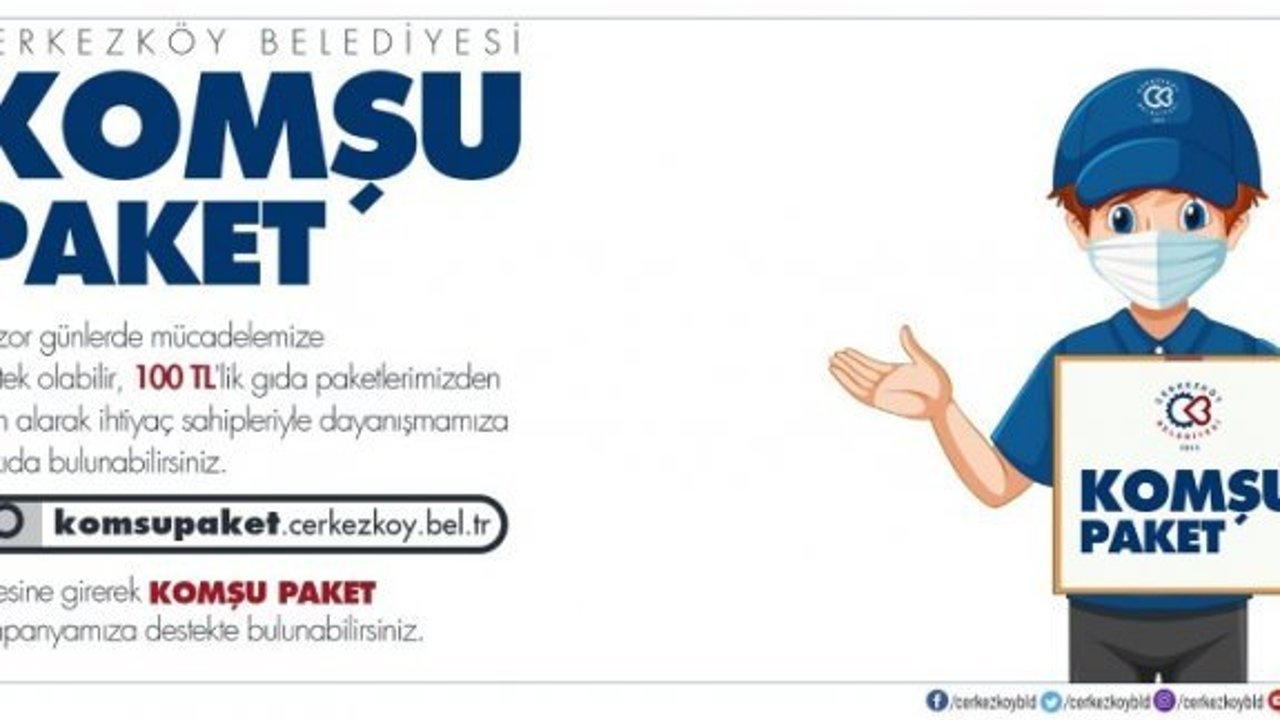 Hayırsever vatandaşlarımız komsupaket.cerkezkoy.bel.tr adresini tıklayarak, ihtiyaç sahibi komşularımıza, anlaşmalı olduğumuz yerel market zincirlerinden, içerisinde temel gıda maddelerinin bulunduğu 100 TL değerindeki Komşu Paketi satın alarak, bu yardım paketlerinin ihtiyaç sahibi komşularımızın evlerine ulaşmasını sağlayabilirler” dedi.